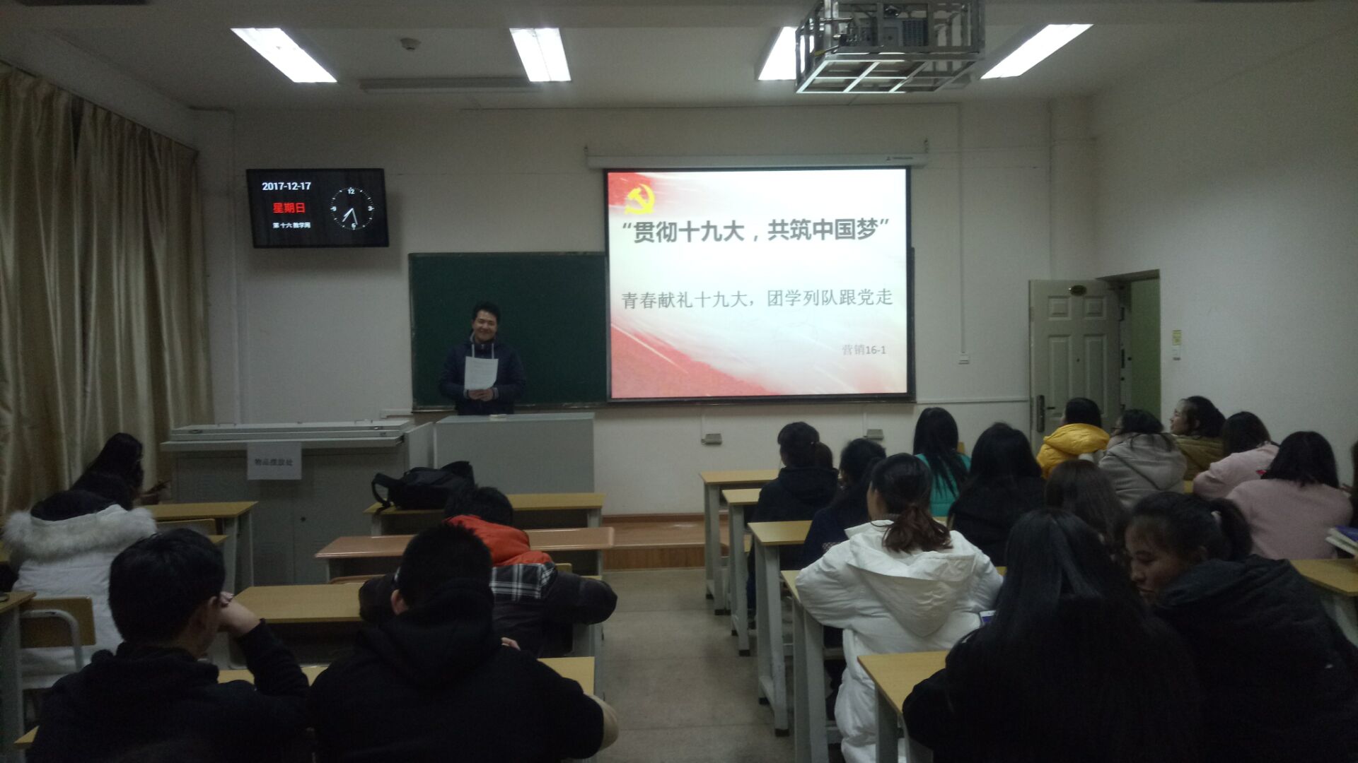 12月17日,商学院营销16-1团支部在北院卓媒224及幸福家园小区爱心食堂分别开展了“贯彻十九大,共筑中国梦—青春献礼十九大,团学列队跟党走”主题团日活动。